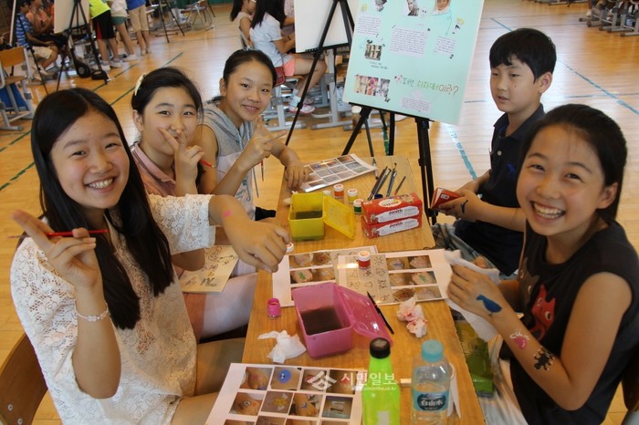 경기 부천시 심원초등학교가 6일 5학년 학생들을 대상으로 진로체험 부스 '나의 꿈을 펼쳐라' 교육을 실시했다. 사진은 학생들이 패션디자이너 직업 부스에서 팔에 다양한 그림을 그리고 있는 모습.(사진제공=부천교육지원청)