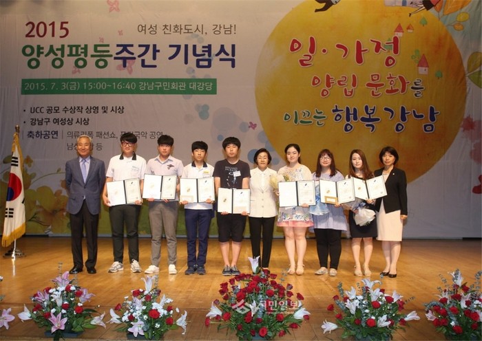 지난 3일 서울 강남구민회관에서 열린 ‘2015, 양성평등 주간 기념식’에 참석한 신연희 강남구청장(오른쪽에서 5번째)이 ‘여성이 행복하고 안전한 도시, 양성이 다함께 살기 좋은 도시’를 주제로 만들어진 10편의 우수 UCC 작품에 대한 시상을 한 뒤 기념촬영하고 있다.(사진제공=강남구청)