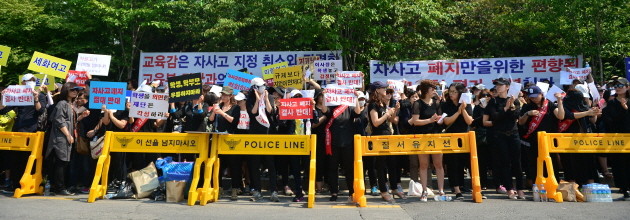 6일 오전 서울 종로구 서울시교육청에서 자율형 사립고 학무모 연합회 소속 학부모들이 자사고 폐지를 반대하는 집회에서 피켓을 들고 있다.