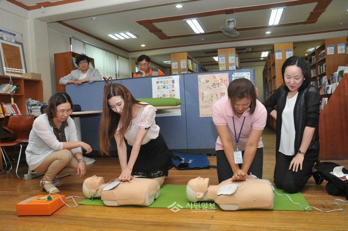 관악소방서가 지난 6일 광신정보고등학교 교사들을 대상으로 '심폐소생술 교육'을 실시했다. 사진은 이날 교육에 참석한 교사들이 심폐소생술 교육을 받고 있는 모습.(사진제공=관악소방서)