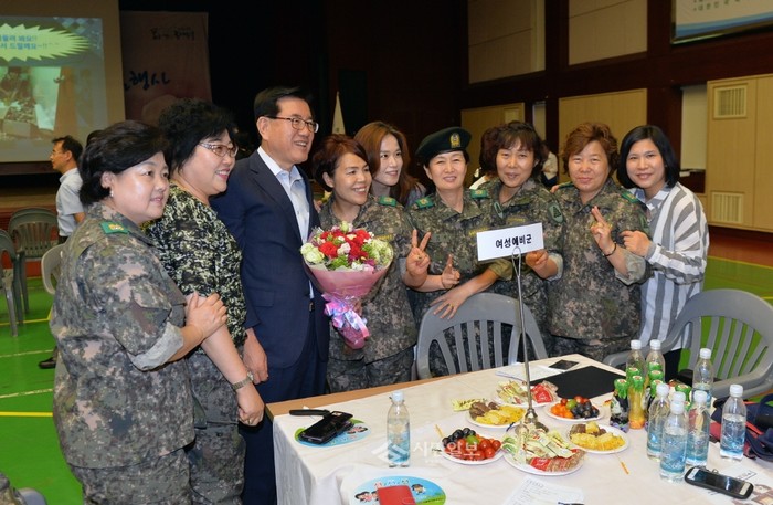 서울 동대문구가 지난 6일 구청 2층 대강당에서 '2015년 양성평등주간 기념행사'를 진행한 가운데 행사에 참여한 유덕열 구청장이 여성예비군들과 함께 기념촬영을 하고 있다.(사진제공=동대문구청)