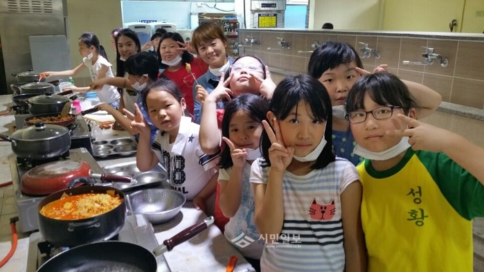 전남 광양시 성황초등학교가 최근 광양백운학생야영장에서 4~6학년 학생들을 대상으로 야영수련활동을 실시했다. 사진은 참여 학생들이 야영 중 먹을 음식을 직접 만들며 기념촬영한 모습.