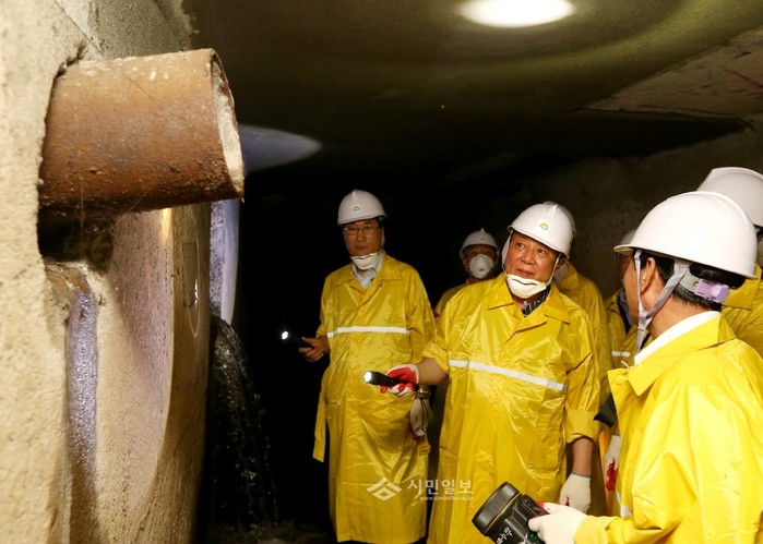 차성수 금천구청장은 지난 7일 침수 취약지역인 시흥사거리 일대 시흥천 복개 하수박스 내부에 들어가 '우기 대비 특별 현장점검'을 실시했다. 사진은 이날 현장점검에서 시설을 점검하고 있는 차 구청장(가운데)의 모습.(사진제공=금천구청)