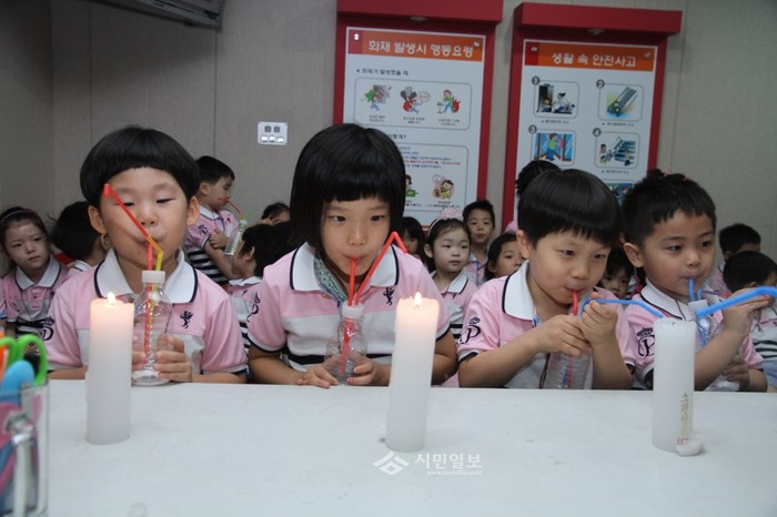서울 동작소방서가 지난 7일 본서 3층 소방안전체험교실에서 메이플유치원 원아들을 대상으로 '소방안전교육'을 실시했다. 사진은 이날 어린이들이 페트병을 이용해 소화기를 만들어 촛불을 꺼보며 소화기 원리체험을 하고 있는 모습.(사진제공=동작소방서)
