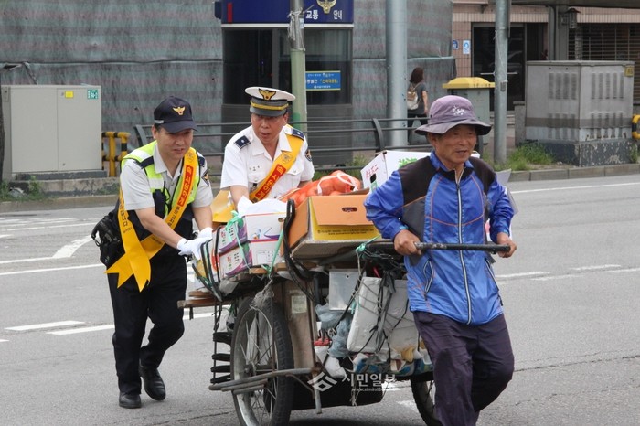 지난 7일 오전 출근시간에 서울 은평구 녹번역 삼거리에서 '선·선·선 캠페인'을 벌이던 서부경찰서와 녹번파출소 경찰들이 힘들게 도로를 건너고 있는 한 노인의 무거운 리어카를 밀며 이동을 돕고 있다.(사진제공=서부경찰서)