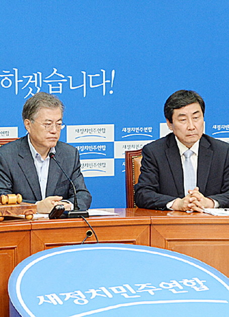 8일 오전 서울 여의도 국회에서 열린 새정치민주연합 최고위원회의에서 문재인 대표와 이종걸 원내대표가 전병헌 최고위원의 발언을 듣고 있다.