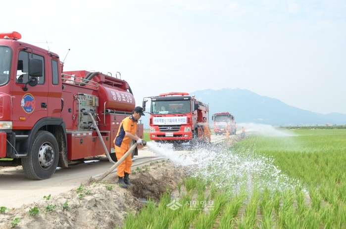 서울 영등포소방서는 최근 극심한 가뭄으로 인한 피해가 발생하고 있는 인천 강화군 지역의 피해를 최소화하고자 '긴급 소방차 급수지원'에 나섰다. 사진은 논에 소방차로 급수 지원을 하고 있는 소방대원들의 모습.(사진제공=영등포소방서)