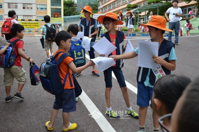 인천 남동소방서는 9일 오전 동부초등학교 정문에서 한국 119소년단과 함께 '여름방학 안전사고 예방 캠페인'을 실시했다. 사진은 이날 캠페인에 참여한 학생들이 여름철 물놀이 안전수칙과 안전사고 예방수칙 등의 내용이 담긴 홍보물을 나눠주고 있는 모습.(사진제공=남동소방서)