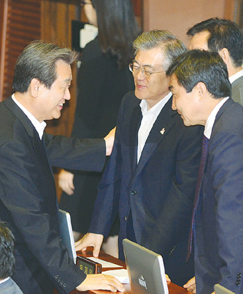 제335회 국회(임시회) 본회의가 열린 9일 오후 서울 여의도 국회 본회의장에서 새누리당 김무성 대표가 새정치민주연합 문재인 대표, 이종걸 원내대표를 찾아가 인사하고 있다.