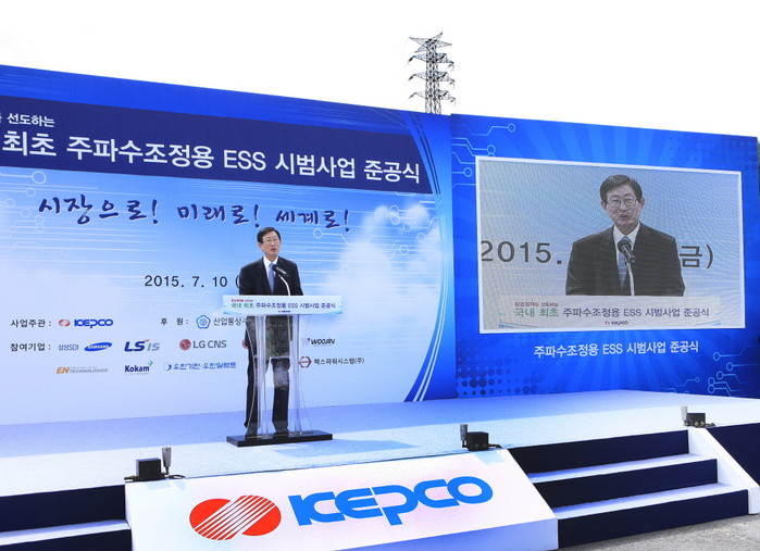 한국전력(사장 조환익)은 10일 조환익 한전 사장을 비롯해 문재도 산업통상자원부 차관, 유상희 전력거래소 이사장, 백수현 한국표준협회장, 김희준 대한전기학회 회장, 삼성SDI 조남성 대표이사, LS산전 한재훈 대표이사 등 관련 학계 및 산업계 관계자 150여명이 참석한 가운데 경기도 안성시에 위치한 서안성변전소에서 국내 최초로 주파수 조정용 에너지저장장치(Energy Storage System, 이하 ‘ESS’) 준공식을 개최했다.
