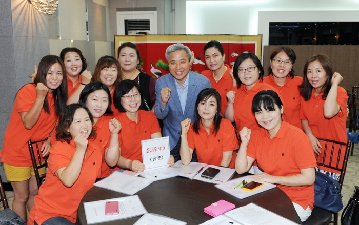 지난 10일 곽상욱 경기 오산시장이 오산웨딩의전당에서 중학생 자유학기제 직업체험 프로그램인 '미리내일학교'의 진로코치로 활동할 학부모들을 대상으로 실시한 '미리내일학교 학부모 진로코치단 워크숍'을 마치고 함께 기념촬영을 하고 있다.(사진제공=오산시청)