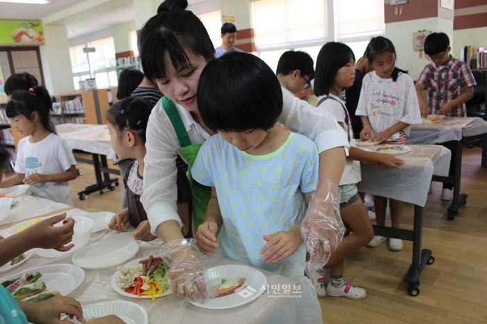 전남 고흥 도덕초등학교는 지난 10일 학생들을 대상으로 베트남 선생님과 함께하는 '찾아가는 다문화 교실'을 개최했다. 사진은 이날 참여 학생이 베트남 선생님과 함께 베트남 전통음식 월남쌈을 만들고 있는 모습.