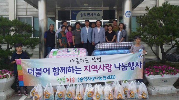 최근 충남 아산시 송악사랑나눔협의회가 지역 복지 향상을 위해 지역내 저소득층 홀몸노인 50가구에 전달할, 더운 여름을 건강하고 시원하게 날 수 있는 이불과 각종 생필품세트를 준비하고 기념촬영을 하고 있다.(사진제공=아산시청)