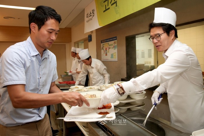 정원오 성동구청장(오른쪽)이 지난 13일 초복을 맞아 구청 구내식당에서 점심식사를 위해 식당을 찾은 직원들에게 삼계탕을 직접 배식하고 있다.(사진제공=성동구청)