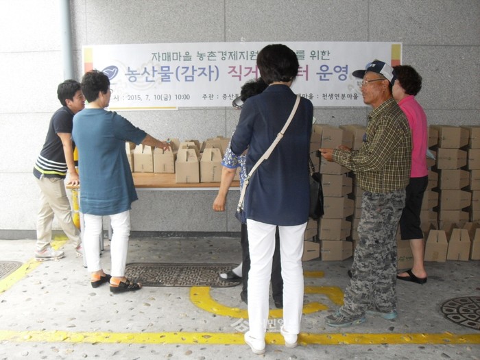 은평구 증산동 주민자치위원회는 최근 중동호흡기증후군(메르스) 여파로 침체에 빠진 자매결연마을(경기 양주시 장흥면 천생연분마을)의 지역경제 활성화를 위해 '농산물(감자) 직거래 장터'를 운영했다고 밝혔다. 사진은 장터에 참여한 관계자들의 모습. (사진제공=은평구청)