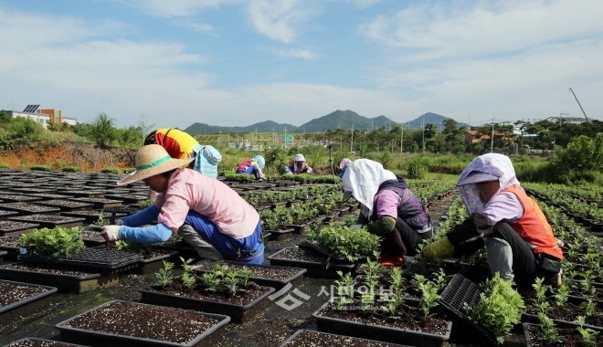 14일 전남 함평군 농업기술센터 인근에서 인부들이 국향대전에 사용할 국화를 논에 옮겨 심고 있다. 올해 국향대전에는 다른 국화축제에서 볼 수 없는 신품종을 선보일 계획이다.(사진제공=함평군청)