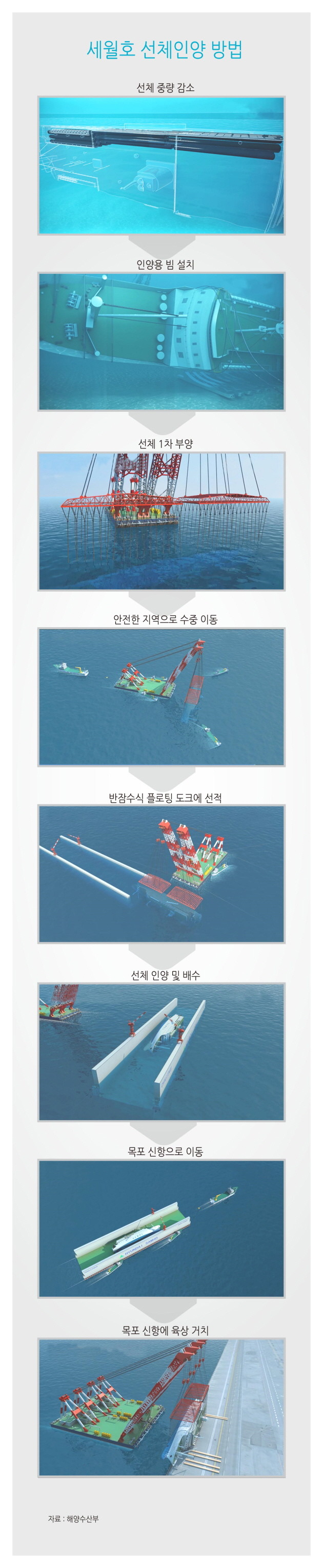 구체적으로 탱크 및 빈 공간에 압축공기를 주입한 후 선체 바닥에 인양용 빔을 설치한다. 선체를 부력과 해상크레인을 이용해 2㎞ 떨어진 안전한 지역으로 옮긴 후 이 지역에서 반잠수 상태로 대기하고 있는 플로팅 도크에 선체를 선적한다.