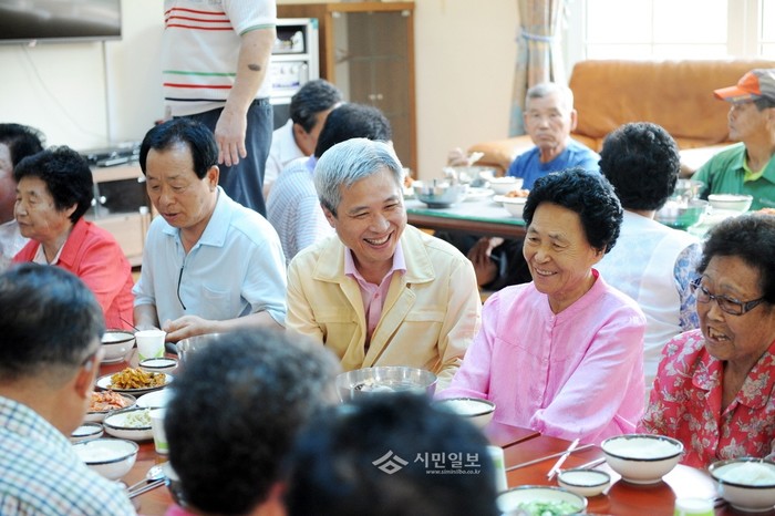 경기 오산시와 오산시 경로효친자원봉사회는 지난 15일 지역내 경로당 3곳을 방문해 노인들에게 삼계탕을 제공하는 '경로당 건강 복달임' 행사를 진행했다. 사진은 이날 한 경로당을 찾은 곽상욱 시장(가운데)이 노인들과 함께 삼계탕을 먹으며 이야기하고 있는 모습.(사진제공=오산시청)