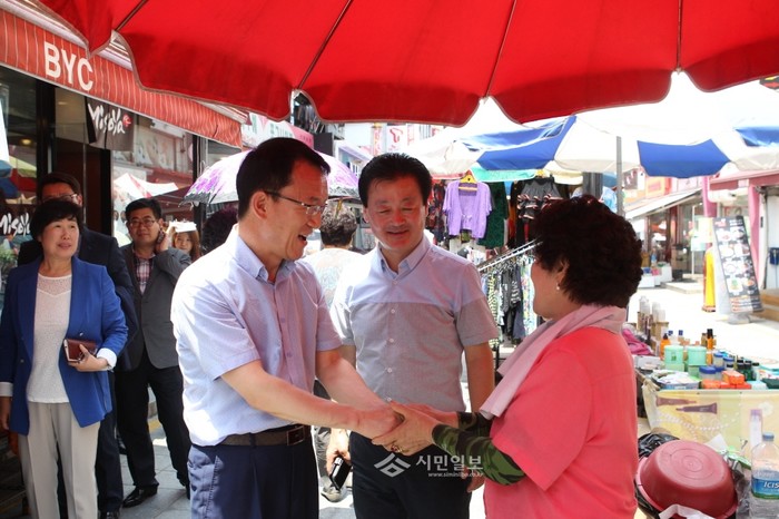 조청식 경기 용인시 부시장이 지난 15일 부임 직후 메르스로 어려움을 겪고 있는 용인 중앙시장 등을 찾아 '민생현장 점검'에 나섰다. 사진은 조 부시장(왼쪽)이 상인을 위로하며 손을 맞잡고 있는 모습.(사진제공=용인시청)
