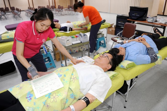 송파구가 16일 오전 구청 대강당에서 중동호흡기증후군(메르스)로 인해 헌혈 참여율이 급감함에 따라 지역내 안정적 혈액 공급을 도모하기 위해 개최한 '사랑의 헌혈' 행사에 참여한 구청 직원들이 헌혈을 하고 있다.(사진제공=송파구청)