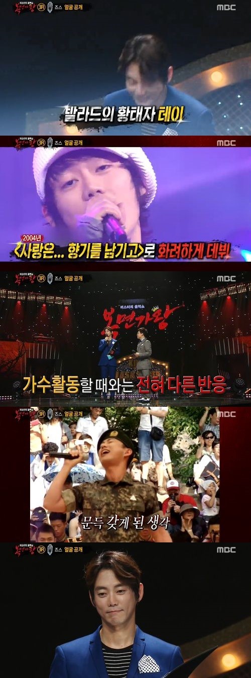 가면을 벗은 테이는 “오랜만에 인사드린다. 가수 테이다”며 “군대를 갔다 왔고, 요즘은 앨범 작업중이다”고 근황을 전했다.