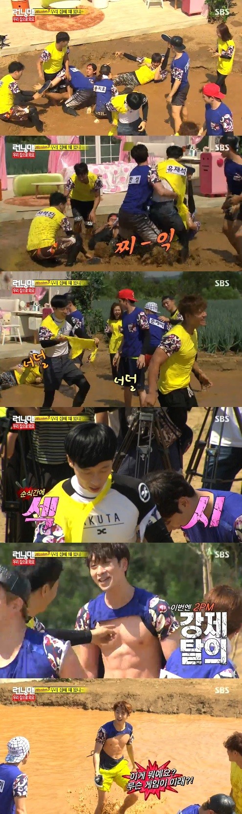 이어진 게임에서 '런닝맨' 멤버들과 2PM 멤버들은 옷이 찢길 정도로 격렬한 대결을 펼쳤다. 특히 옥택연을 아웃시키는 과정에서 옷이 완전히 찢어진 윶석은 노란색 비닐을 입고 나타나 웃음을 자아냈다.