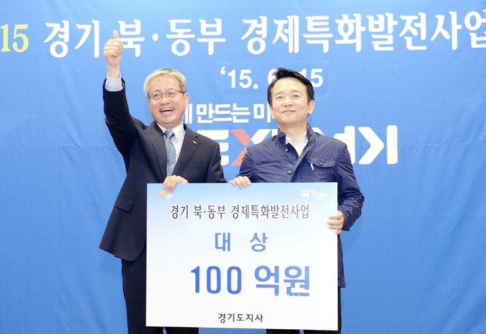 | ▲ 경기도 주관으로 열린 '경기 북·동부 경제특화발전사업' 공모에서 파주시의 '파주 장단콩 웰빙마루 프로젝트'가 대상을 수상한 가운데 이재홍 파주시장(왼쪽)이 남경필 경기도지사와 기념촬영을 하고 있다. | ||