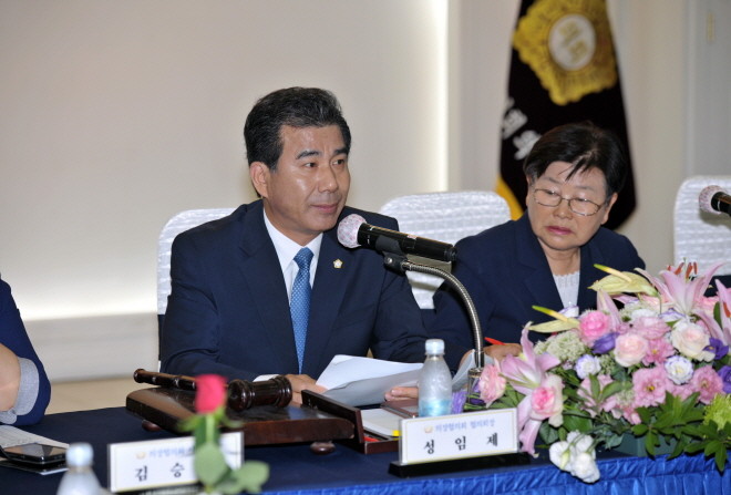 최근 서울시 영등포구에서 의장협의회의 지속적 발전을 위한 하반기 워크샵 실시, 8월 월례회의 개최 향후일정 등을 주제로 열린 ‘7월 월례회의’에 참석한 성임제 구의회의장협의회 회장(가운데)가 회의 진행을 하고 있다. (사진제공=강동구의회)