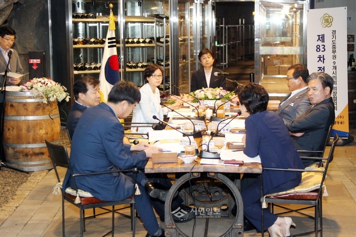[광명=류만옥 기자]최근 경기도 광명시의회 주관으로 광명동굴에서 열린 ‘중부권의장협의회 제83차 정례회’에 참가한 9개 시·군 의장단이 회의록 승인, 현안사항 협의건, 의회별 활동사항 청취의 건 등의 심의를 하고 있다.