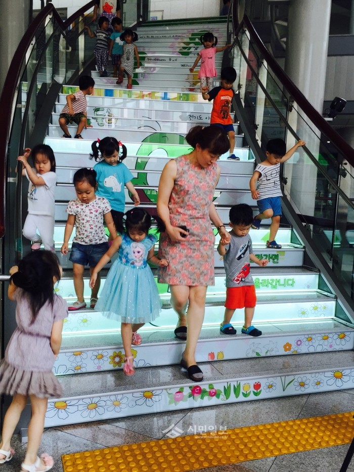 서울 도봉구가 최근 구청사 중앙계단을 둘리캐릭터로 꾸며 '둘리 건강 계단'을 조성한 가운데 청사를 방문한 아이들이 오르내리고 있다. 둘리 건강 계단은 1회 이용시 10원씩 적립되며 적립금은 불우이웃에게 기부된다. (사진제공=도봉구청)