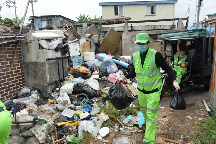 서울 동대문구 환경미화원들이 지난 20일 오후 1시30분 제기4구역내 쓰레기 상습무단투기 현장에서 쓰레기를 처리하며 구슬땀을 흘리고 있다.(사진제공=동대문구청)