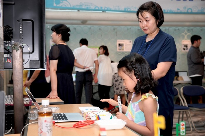 성동구가 최근 구청 1층 비전갤러리에서 '어린이 프로그래밍 교육선생님 양성 과정' 1기 수료생들의 작품 전시회를 개최했다. 사진은 작품 전시회를 찾은 한 어린이가 공작물을 직접 다뤄보고 있는 모습.(사진제공=성동구청)