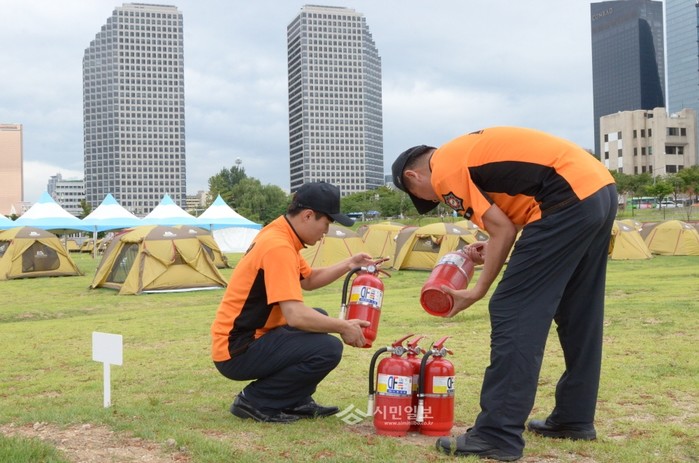 영등포소방서가 지난 20일 오후 여의도 한강공원 마포대교 하류 너른들판 캠핑장에서 소화기 점검 등의 소방훈련을 실시했다. 사진은 이날 소방대원들이 캠핑장에 설치된 소화기를 점검하고 있는 모습.(사진제공=영등포소방서)