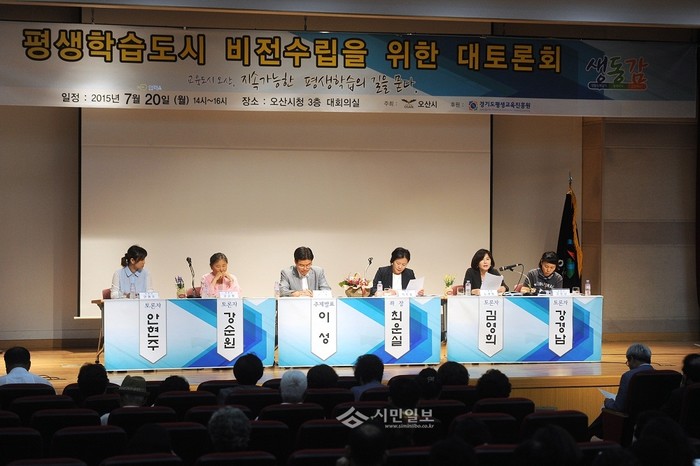 지난 20일 경기 오산시가 시청 대회의실에서 실시한 ‘평생학습도시 비전수립 토론회’에 참가한 최운실 아주대 교수와 이성 경기도평생교육진흥원장이 토론자들과 함께 토론회를 진행하고 있다.(사진제공=오산시청)