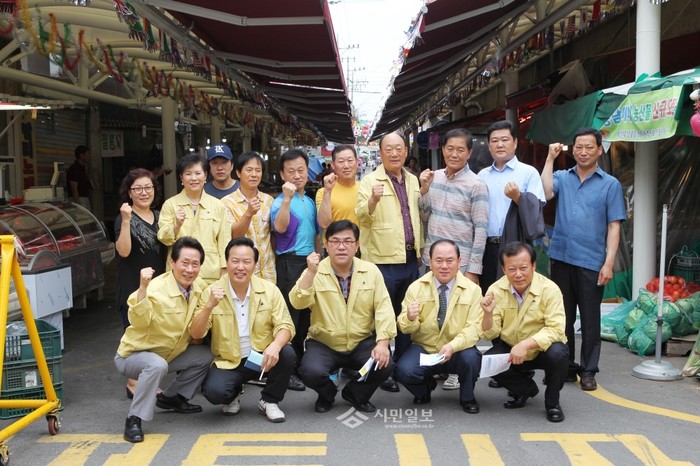 | ▲ 지역경제살리기연구회원들이 성내전통시장을 방문해 상인들과 함께 전통시장 활성화를 위해 파이팅을 외치고 있다. | ||