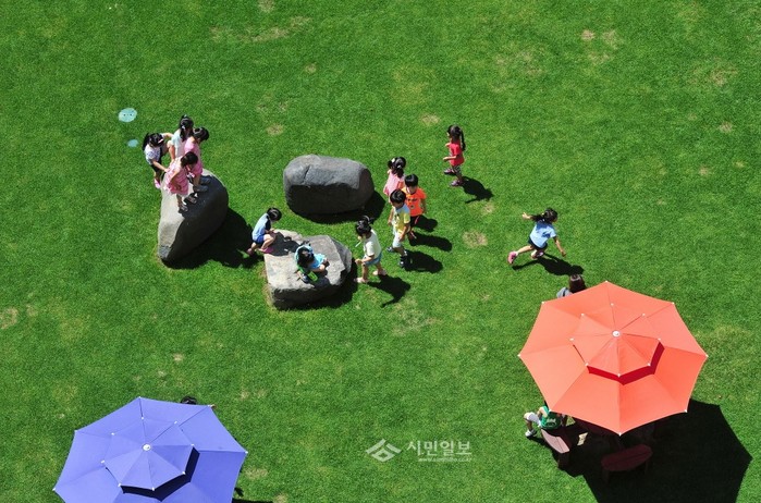 인천 부평구청 잔디광장인 '어울림마당'이 최근 여름 방학을 앞둔 어린이들의 방문이 늘어 어린이들의 놀이터로 변하고 있다. 사진은 어울림마당을 찾은 어린이들이 파라솔 옆 바위에서 뛰어놀고 있는 모습.(사진제공=부평구청)