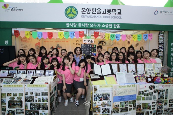 충남 아산시 온양한올고등학교가 최근 여수세계박람회에서 개최된 '2015 대한민국 행복학교 박람회'에 충남지역 대표로 참가해 체험를 운영했다. 사진은 형광메모판 만들기, 필러비즈 체험 등이 가능한 부스를 운영하며 기념촬영한 학생들의 모습.