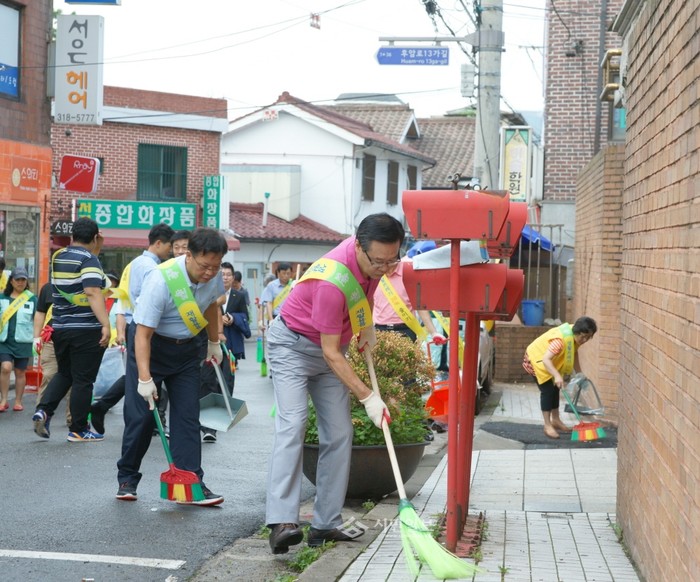 22일 용산구가 여름 휴가철을 맞아 16개동 전역에서 '대청소(클린데이) 행사'를 펼친 가운데 성장현 구청장이 이른 아침 후암동을 찾아 주민들과 함께 거리청소를 하고 있다. (사진제공=용산구청)