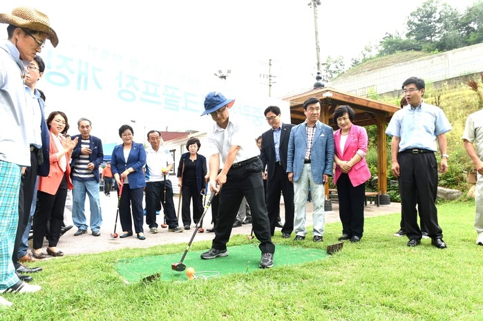 노원구가 지난 21일 오후 2시 중랑천 입구에서 녹천교 사이 자전거도로 옆 하천부지에서 '중랑천 파크골프장 개장식'을 열었다. 사진은 김성환 구청장(가운데)이 개장식 행사 후 파크골프 시구를 하고 있는 모습.(사진제공=노원구청)