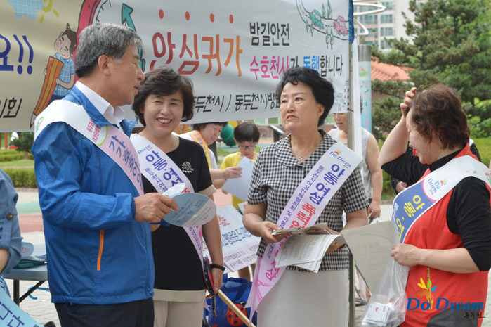 경기 동두천시와 경기여성연대는 최근 양성평등주간 기념 캠페인을 실시했다. 사진은 캠페인에 참석한 오세창 시장(왼쪽)이 관계자들과 홍보 활동을 펼치며 이야기 하고 있는 모습.(사진제공=동두천시청)