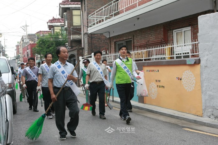 지난 22일 서울 강동구 ‘성내2동 주민과 함께하는 클린데이 대청소’에 참여한 이해식 구청장(오른쪽)이 구청직원들과 함게 동네 골목길을 돌며 청소를 하고 있다.(사진제공=강동구청)