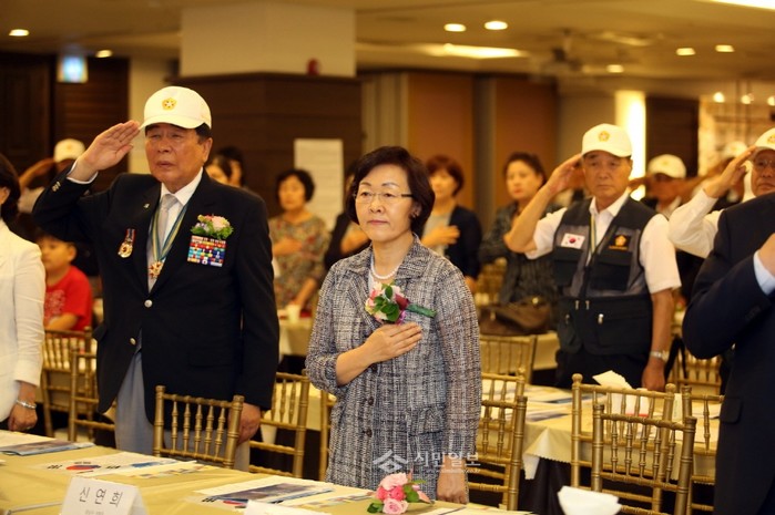 지난 21일 신연희 서울 강남구청장이 6.25전쟁 65주년을 맞아 참전유공자 강남구 지회에서 마련한 ‘안보결의대회’에 참석해 국기에 대한 경례를 하고 있다.(사진제공=강남구청)