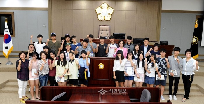 경기 수원시의회는 최근 수원시 주민참여예산 청소년위원회 위원 30여명을 대상으로 의회 견학을 실시했다. 사진은 시의회를 찾은 청소년 위원들이 본회의장 견학 후 기념촬영한 모습.