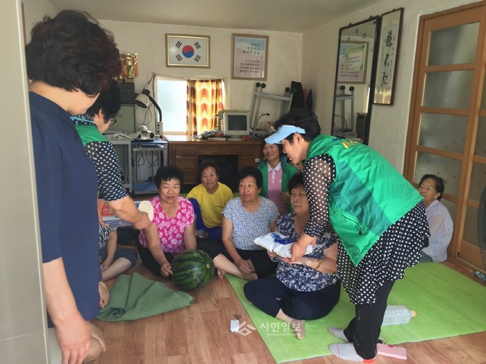 전남 진도군 진도읍 새마을부녀회가 중복 하루 전인 지난 22일 지역내 35개 마을 경로당을 직접 방문해 사랑의 복달임 행사를 진행했다. 사진은 회원들이 한 경로당을 방문해 수박, 국수, 설탕 등을 전달하고 있는 모습.(사진제공=진도군청)