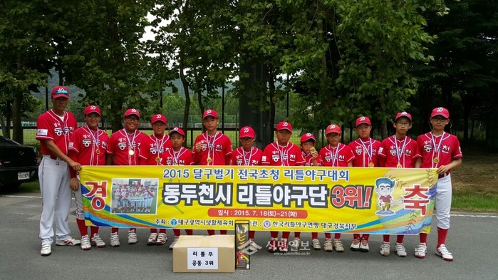 최근 창단 1년을 맞은 경기 동두천시 리틀 야구단이 대구 강병학생야구장에서 열린 ‘2015년 달구벌기 전국 리틀야구대회’에 참가해 전국대회 3위를 차지하고 기념촬영을 하고 있다.