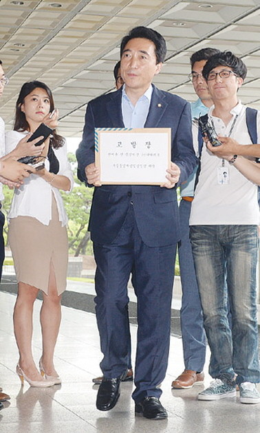 박수현 새정치민주연합 원내대변인이 23일 오후 새정치민주연합 국민정보지키기 위원회의 국정원 해킹 의혹과 관련해 원세훈 전 국정원장, (주)나나테크를 검찰에 고발하기 위해 서울 서초구 서울중앙지검으로 들어서고 있다.