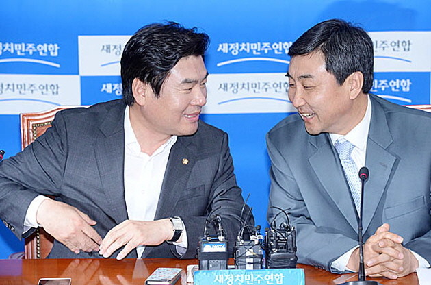 새누리당 원유철 원내대표와 새정치민주연합 이종걸 원내대표가 추경 예산안 처리를 앞둔 23일 오후 서울 여의도 국회 새정치민주연합 원내대표실에서 열린 최종 협상을 위한 회동에서 이야기를 나누고 있다.