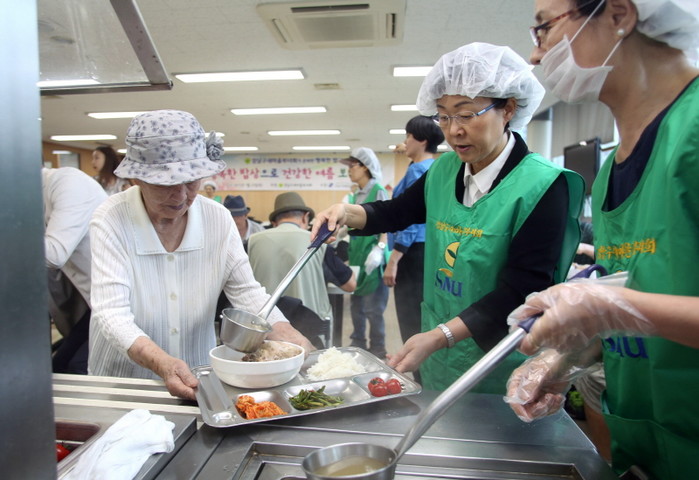최근 신연희 서울 강남구청장(오른쪽에서 두 번째)이 중복을 맞아 강남노인종합복지관에서 열린 ‘사랑의 삼계탕 나누기’에 참석해 노인들에게 삼계탕 배식을 하고 있다.(사진제공=강남구청)