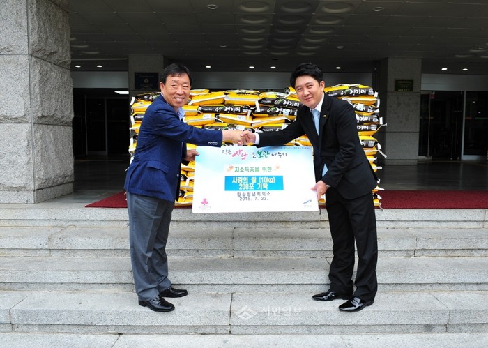 경기 안산청년회의소는 최근 저소득층을 위한 '제4회 사랑의 쌀 나누기 골프대회'를 개최해 마련한 성금으로 쌀 200포를 구매해 안산시에 기탁했다. 사진은 기탁식에서 제종길 시장(왼쪽)과 임상각 안산청년회의소 회장이 악수하며 기념촬영한 모습.(사진제공=안산시청)