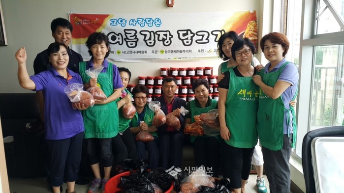 경기 고양시 덕양구 능곡동 새마을부녀회가 최근 지역내 소외계층을 위한 사랑나눔 김치 담그기 행사를 진행했다. 사진은 이날 참여 회원들이 직접 담근 김치를 들고 기념촬영한 모습.(사진제공=고양시청)